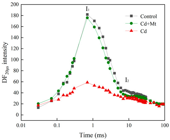On the DF curve, characteristic points I1 and I2 correspond to distinct physiological processes. The appearance of the I1 point signifies the accumulation of the luminescent complex Z+P680QₐQB− and the establishment of transmembrane potential induced by PSI oxidation. Conversely, the I2 point correlates with the PQ pool’s reduced state, indicating the accumulation of Z+P680Qₐ−QB− [48]. Decreased I1 and I2 points under Cd stress (Figure 7) indicate reduced electron donation to P680, decreased reaction center activity, and inhibited P680 reactivation, limiting light-harvesting complex formation. This response may be due to a decrease in OEC efficiency, consistent with observations in rapid fluorescence induction curves. Although DF and transient fluorescence derive from distinct mechanisms, both serve as indicators of photosynthetic electron transport chain status. Transient fluorescence highlights the reduction state of the primary electron acceptor QA− at various time points, while DF occurs during charge recombination in different PSII states. Consequently, DF provides an intuitive reflection of PSII’s functional state. Enhanced DF intensity indicates an accelerated BET rate in PSII, likely associated with OEC protection and the regulatory effects of exogenous MT on the photosynthetic electron transport chain.