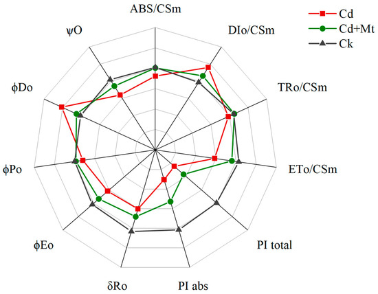 Radar plot of JIP test parameters of R. simsii leaves under exogenous MT and cadmium stress treatment for 12 days. For each parameter, the value for the comparison was set to 1.