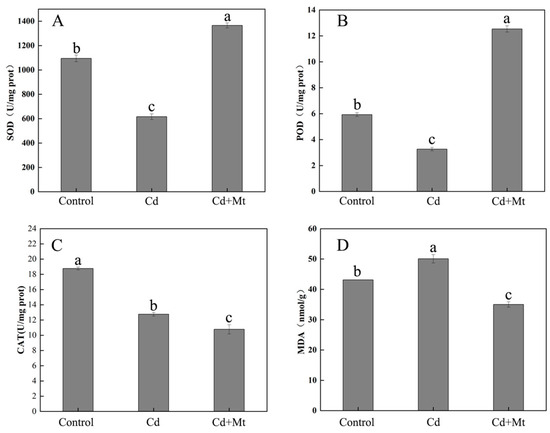 When comparing the overall fresh weight of the plants (Figure A1), the Cd treatment group at day 10 showed a slight reduction in fresh weight compared to the control group, while the fresh weight level of the CdMT treatment group was somewhere between the two. When measuring the fresh weight of different plant parts, the Cd treatment group exhibited a significant decrease in the leaf fresh weight, while the CdMT treatment group showed a relatively smaller reduction in the leaf fresh weight. This suggests that the application of exogenous MT provided some protective effects on the leaf tissue of the plants.