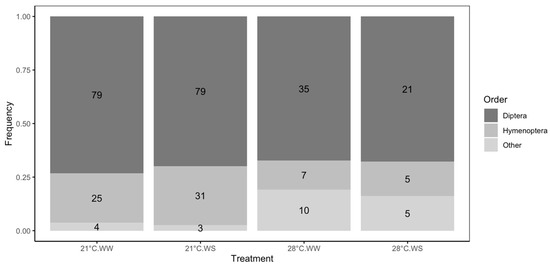 The proportions of the different insects also varied according to the treatment (χ2 = 22.79, p = 0.0008, Figure 5). The proportions of Diptera and mainly Hymenoptera were higher at 21 °C than at 28 °C, while the proportions of other insects were higher at 28 °C. Indeed, between 67.3% and 73.8% of visitors were Diptera at 21 °C compared with 67% at 28 °C, and between 22.4% and 27.4% were Hymenoptera at 21 °C compared with 13.1% to 16.1% at 28 °C. However, less than 3% of the visitors belonged to other orders at 21 °C compared with more than 16% at 28 °C.