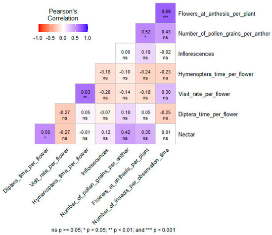 To determine whether the differences observed between treatments for the pollinator visiting behavior could be explained by differences in floral display and floral resources, a Pearson’s correlation matrix was elaborated (Figure 6). A total of 4 out of 28 correlations were significant and positive; no significant negative correlations were observed. The number of insects visiting the flowers per session was positively correlated with the number of open flowers per plant (R = 0.69, p < 0.001). The number of pollen grains per anther was also positively correlated with the number of flowers in anthesis per plant (R = 0.52, p < 0.05). Regarding the insect behavior, the time spent per flower by Diptera increased with the nectar volume per flower (R = 0.50, p < 0.05). The flower visit rate was also positively correlated with the time spent by the Hymenoptera on the flowers (R = 0.63, p < 0.01).