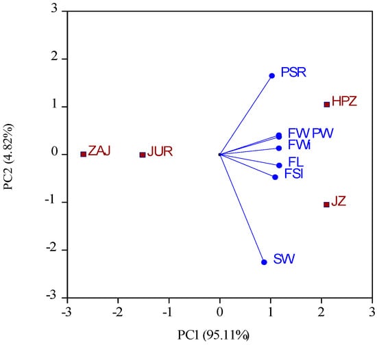 Biplot for fruit-, pulp-, and stone-related traits in jujube genotypes. HPZ-‘Hu Ping Zao’; JZ—‘Jun Zao’; ZAJ—Z. acido-jujuba; JUR—‘Jurilovca’; FL—fruit length; FWi—fruit width; FSI—fruit shape index; FW—fruit weight; PW—pulp weight; SW—stone weight; PSR—pulp-to-stone ratio.