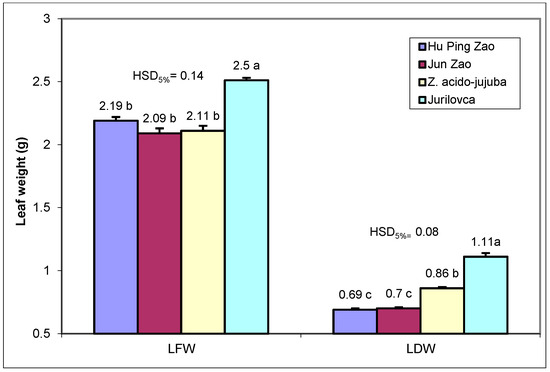 Fresh and dry weight of leaves from jujube genotypes. Different letters (a, b, and c) indicate significant differences between genotypes at p < 0.05 according to the Tukey test. LFW—Leaves fresh weight; LDW—Leaves dry weight.
