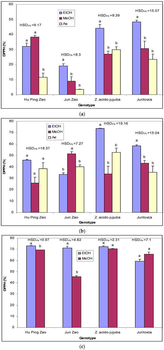 The effect of extraction solvents on DPPH radical scavenging activity (%) in the leaves (a), pulp (b), and stones (c) of jujube genotypes. EtOH—ethanol extract; MeOH—methanol extract; Ae—aqueous extract. Different letters indicate significant differences between solvents at p < 0.05 according to the Tukey test.