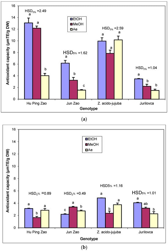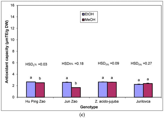 The effect of solvents on the antioxidant capacity of leaf extracts (Figure 4a) varied according to the genotype. In ‘Hu Ping Zao’, ethanol and methanol showed similar efficacy, significantly higher than that of water. The solvent influence was strongest for ‘Jun Zao’, with significant differences among the three solvents, ethanol extract having the highest value and aqueous extract the lowest. For the wild genotype Z. acido-jujuba, the antioxidant capacity of the leaves was not significantly affected by the solvents. In ‘Jurilovca’, ethanol had a greater effect on the antioxidant capacity than methanol and aqueous extracts.