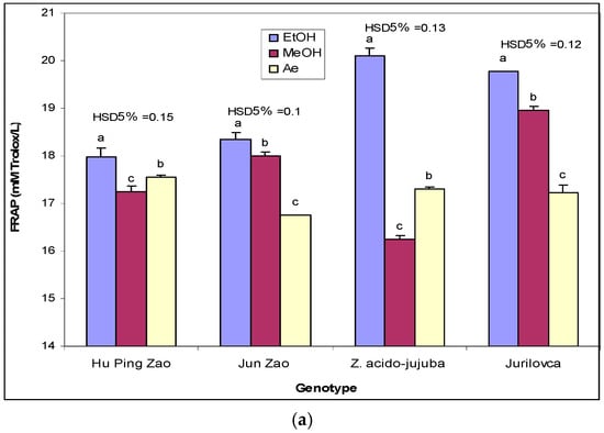 For all genotypes, the solvent used had a significant effect on the FRAP of leaf extract, with the highest value for ethanol (Figure 5a). In the cases of the ‘Jun Zao’ and ‘Jurilovca’ genotypes, the methanol extracts showed significantly higher FRAP values than the aqueous extracts, while in ‘Hu Ping Zao’ and Z. acido-jujuba, the ethanol extracts demonstrated significantly lower FRAP. In pulp samples, the methanol extract had a higher FRAP for the cultivated genotypes, while for wild genotypes, the superiority of ethanol extracts was obvious (Figure 5b). In the case of stone samples, the FRAP values of ethanol extracts were significantly higher in wild genotypes, while for cultivated genotypes, the methanol extracts presented the best FRAP values (Figure 5c).