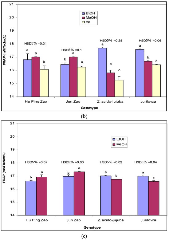 The effect of extraction solvents on FRAP (μM TE/L) in leaf (a), pulp (b), and stone (c) of jujube genotypes. EtOH—Ethanol extract; MeOH- Methanol extract; Ae—Aqueous extract. Different letters indicate significant differences between solvents at p < 0.05 according to the Tukey test.