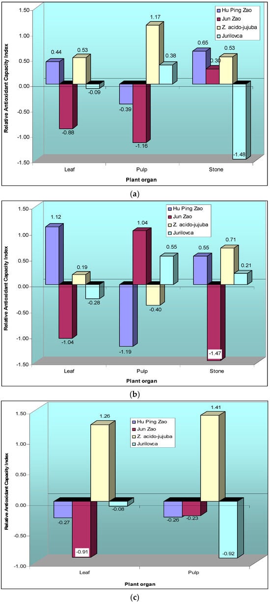 Based on the relative antioxidant capacity index (RACI), the ethanolic leaf extracts of Z. acido-jujuba and ‘Hu Ping Zao’ showed the highest antioxidant capacity (Figure 6a). For pulp extracts, the wild genotypes, particularly Z. acido-jujuba, showed superior antioxidant capacity. In the case of stone extracts, all genotypes except Jurilovca showed higher antioxidant capacity than cultivated varieties.