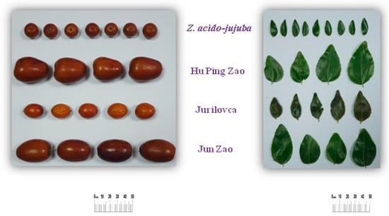 - Razi, M.F.; Anwar, R.; Basra, S.M.A.; Khan, M.M.; Khan, I.A. Morphological characterization of leaves and fruit of jujube (Ziziphus mauritiana Lamk.) germplasm in Faisalabad, Pakistan. Pak. J. Agric. Sci. 2013, 50, 211–216. [Google Scholar]