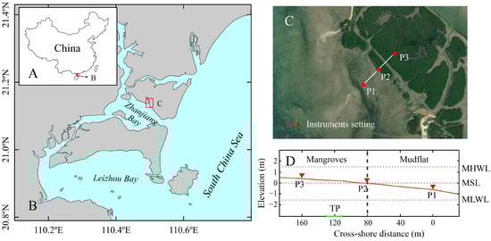 (A) Schematic map of the Leizhou Peninsula and its location in relation to China. (B) The geomorphology of Zhanjiang Bay and the relative location of the study area. (C) Location of hydrological observation sites in the study area. (D) Elevation with respect to mean sea level (MSL) of the cross-shore transect including instrument positions. The vegetation zone and mudflat on the transect are demarcated by dashed line. Plot location for the vegetation survey is shown on the horizontal coordinate. Tidal water levels are indicated at the right axis (MHWL, mean highwater level; MLWL, mean low water level).