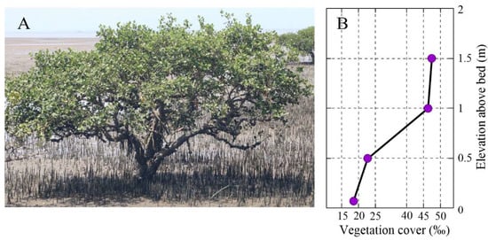 (A) Characteristic of Avicennia marina (Forsk.) Viern. in the study area. (B) Variation in horizontal vegetation cover with elevation above the forest floor.