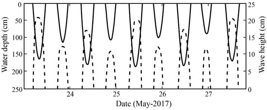 The water depth (solid lines) and wave height (dotted lines) at the outermost station P1 during the observation period.