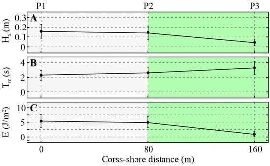 Wave parameter conditions along the transect. (A) Significant wave heights Hx (m); (B) mean wave periods Tm (s); and (C) total wave energy Em (J/m2).