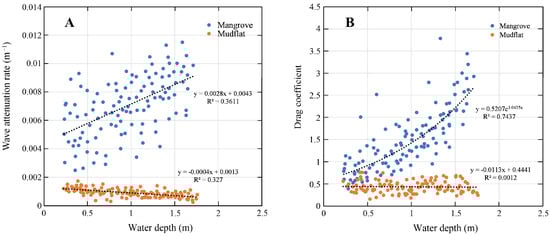 The linear regression relationship between wave height reduction per meter of cross-shore in the mangroves and water depth can be expressed as r = −2.8 × 103·h + 4.3 × 103 (R2 = 0.36) (Figure 6A). As expected from this relationship, the drag coefficient Cd also showed a positive correlation with water depth, satisfying the exponential relationship of r = 0.5207e1.0435h (R2 = 0.74) (Figure 6B). The characteristics of these relationships reveal that as the water level increases, the resistance of the mangrove to waves comes not only from the trunk and roots but also from the canopy layer.