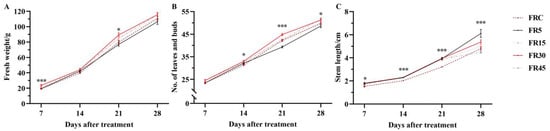 Dynamics of lettuce morphology at different days after treatment (DAT) harvests. Shoot fresh weight (A), number of leaves and buds (B), and stem length (C) of lettuce at different DAT. The values are the mean ± SEM of three replicates, * indicates significance results of one-way ANOVA, * p < 0.05 and *** p < 0.001.