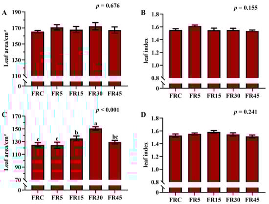 Leaf area and leaf index of lettuce under different treatments. Leaf area (A) and leaf index (B) of the 10th leaf. Leaf area (C) and leaf index (D) of the 18th leaf. The values are the mean ± SEM of three replicates, and the letters indicate the significant differences among different treatments (p < 0.05), significant results of one-way ANOVA are shown.