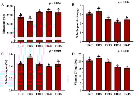 Differences in lettuce quality under different treatments. Nitrate (A), soluble proteins (B), soluble sugars (C), and vitamin C (D). The values are the mean ± SEM of three replicates, and the letters indicate the significant differences among different treatments (p < 0.05); significant results of one-way ANOVA are shown.