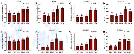 Expression analysis was performed on several hormone metabolism and transport-related genes in the stem tip, including the cytokinin metabolism genes Lactuca sativa LONELY GUY 5 (LsLOG5) and Lactuca sativa ISOPENTENYLTRANSFERASE 3 (LsIPT3), the gibberellin metabolism-related gene Lactuca sativa GIBBERELLIN 20-OXIDASE 2 (LsGA20OX2), the abscisic acid metabolism gene Lactuca sativa 9-CIS-EPOXYCAROTENOID DIOXYGENASE 2 (LsNCED2), the auxin metabolism gene Lactuca sativa PROBABLE INDOLE-3-PYRUVATE MONOOXYGENASE YUCCA 5 (LsYUC5), the auxin response gene Lactuca sativa SMALL AUXIN UP RNA 71 (LsSAUR71), the auxin inactivation and degradation gene Lactuca sativa GRETCHEN HAGEN 3.6 (LsGH3.6), and the phytohormone transport-related gene Lactuca sativa ATP-BINDING CASSETTE B6 (LsABCB6).