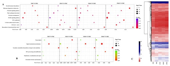 KEGG pathway enrichment analysis of DEGs from the four intermittent far-red light treatments compared to the FRC treatment revealed that these intermittent treatments primarily affected pathways such as the MAPK signaling pathway, biosynthesis of unsaturated fatty acids, steroid hormone biosynthesis, and other pathways directly or indirectly involved in plant signaling, hormone metabolism, or transport (Figure 6A). Meanwhile, KOG enrichment analysis also indicated that intermittent treatment, compared to FRC treatment, led to enrichment in functions related to signal transduction mechanisms and the biosynthesis, transport, and catabolism of secondary metabolites (Figure 6B). These results highlight the differential response in signal transduction and metabolic transport of plant signaling molecules under intermittent far-red light treatment compared to FRC treatment.