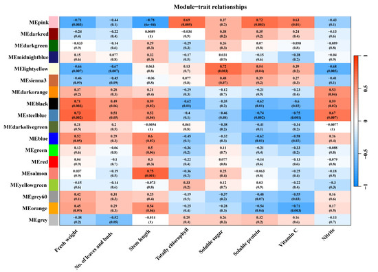Co-expressed modules in relation to lettuce yield and quality indicators. Numbers in the heatmap denote the correlations of the corresponding module eigengenes and traits, and the values in the brackets indicate the p-value for their correlations.