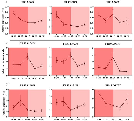 Dynamic expression of three phytochrome-responsive genes LsPIF1, LsPIF3, and LsPIF7 under different intermittent far-red light treatments. (A) Dynamic expression in the FR15 treatment, with far-red light on from 14:00 to 14:15 and off from 14:15 to 14:30. (B) Dynamic expression in the FR30 treatment, with far-red light on from 14:00 to 14:30 and off from 14:30 to 15:00. (C) Dynamic expression in the FR45 treatment, with far-red light on from 14:00 to 14:45 and off from 14:45 to 15:30. The values are the mean ± SEM of three replicates.