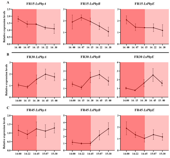 Dynamic expression of three phytochrome genes LsPhyA, LsPhyB, and LsPhyE under different intermittent far-red light treatments. (A) Dynamic expression in the FR15 treatment, with far-red light on from 14:00 to 14:15 and off from 14:15 to 14:30. (B) Dynamic expression in the FR30 treatment, with far-red light on from 14:00 to 14:30 and off from 14:30 to 15:00. (C) Dynamic expression in the FR45 treatment, with far-red light on from 14:00 to 14:45 and off from 14:45 to 15:30. The values are the mean ± SEM of three replicates.