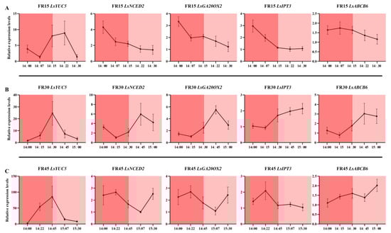 Dynamic expression of five hormone metabolism or transport-related genes LsYUC5, LsNCED2, LsGA20OX2, LsIPT3, and LsABCB6 under different intermittent far-red light treatments. (A) Dynamic expression in the FR15 treatment, with far-red light on from 14:00 to 14:15 and off from 14:15 to 14:30. (B) Dynamic expression in the FR30 treatment, with far-red light on from 14:00 to 14:30 and off from 14:30 to 15:00. (C) Dynamic expression in the FR45 treatment, with far-red light on from 14:00 to 14:45 and off from 14:45 to 15:30. The values are the mean ± SEM of three replicates.