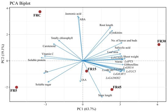 Principal component analysis (PCA) indicated that the FR30 treatment was the furthest from the FR5 treatment, which aligned with the greatest differences observed between the two treatments across all indices. Nutrient indices, including vitamin C, soluble protein, soluble sugar, and photosynthetic pigments, were highest in the FR5 treatment, demonstrating a comparative correlation among these indices. Conversely, indicators crucial for yield, such as fresh weight, number of leaves and buds, cytokinins, and gibberellins, pointed to the FR30 treatment, highlighting its superiority in yield (Figure 11).