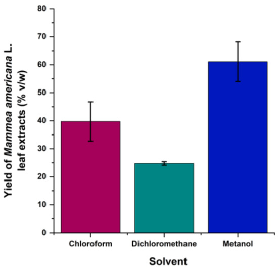 As seen in Figure 1, methanol showed the highest solvent affinity for extracting the chemical constituents of Mammea americana fresh leaves by the extraction method applied. Despite dichloromethane having the lowest affinity for extraction, it had the lowest variability in extraction yield (%), as seen with the error bars representative of the standard deviation.