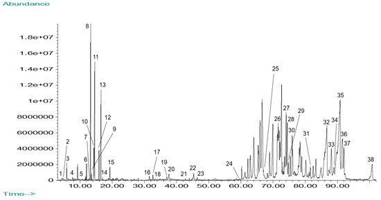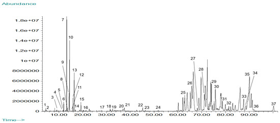 The total ion chromatogram for the GC-MS analysis of Mammea americana chloroform (MAC) leaf extract is shown in Figure 2. From the separated chromatographic peaks, a total of 37 phytochemical constituents were identified, corresponding to 40.46% of the chromatogram’s total area (Table 1).
