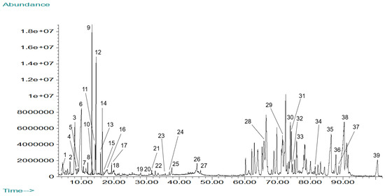 The total ion chromatogram for the GC-MS analysis of Mammea americana methanolic (MAM) leaf extract is shown in Figure 4. A total of 39 phytochemical constituents were identified from the separated chromatographic peaks, corresponding to 52.81% of the chromatogram’s total area (Table 3).