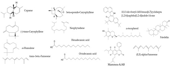 Molecular structures for shared phytochemical constituents in the three analyzed leaf extracts from Mammea americana L. (Calophyllaceae) were identified by GC-MS analysis [24].