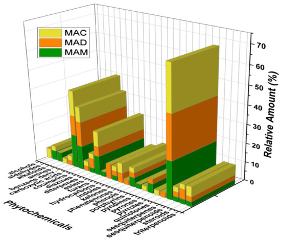 In general, the three leaf extracts obtained from Mammea americana L. (Calophyllaceae) were mainly composed of sesquiterpenes, followed by carboxylic acids, coumarins, esters, diterpenes, phenols, steroids, triterpenoids, indoles, and sesquiterpenoids, in order of decreasing relative amount % (Figure 6).