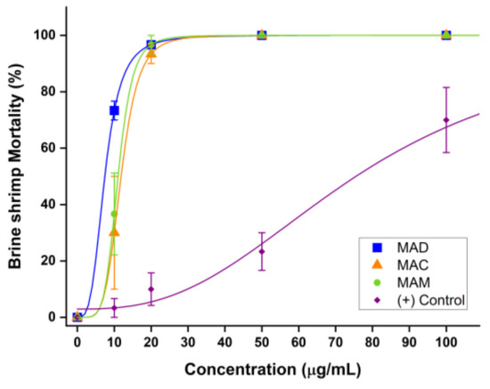 Dose–response curves for the brine shrimp lethality bioassays with the different leaf extracts in Figure 7 are zoomed into the 0–100 μg/mL concentration range for evaluation purposes. These curves show an increase in brine shrimp mortality percentage with increasing extract concentration for MAD, MAC, and MAM extracts, which are much more toxic to brine shrimp than the positive control.