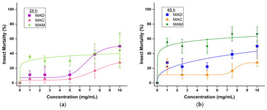 The nonlinear curve fitting with logistic regression used to analyze the 24 h dose–response curves resulted in a very high correlation between experimental variables, with R2 values of 0.911 for MAM, 0.957 for MAD, and 0.961 for MAC (Table 7). The p-values obtained were 0.03 for MAM and 0.04 for both MAD and MAC, confirming that an effect from the applied treatment was observed for all tested extracts at 24 h, since Student’s t-test for p ≤ 0.05 means that the treatment response was significantly different from control. In contrast, the 48 h dose–response curves resulted in a low correlation between experimental variables for MAC, with an R2 value of 0.478, in a high correlation for MAD, with an R2 of 0.813, and a very high correlation for MAM, with an R2 of 0.943. The p-values obtained for the 48 h dose–response curves were 0.26 for MAC, 0.09 for MAD, and 0.02 for MAM, which according to Student’s t-test, means that the treatment response was significantly different from control only for MAM extract insecticidal bioassay after 48 h.