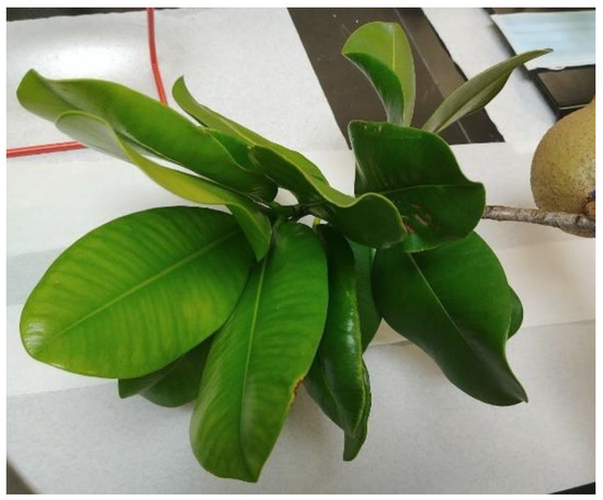 Fresh leaves of Mammea americana L. (Calophyllaceae) were collected in October 2018 from a tree located in a mountainous wild area at an altitude of about 372 m above sea level (Latitude 18°21′ N, Longitude −67°04′ W) in Mayagüez, Puerto Rico (Figure 9). The samples were identified and authenticated by Dr. Jeanine Vélez-Gavilán, botanist and taxonomist from the Department of Biology. An equivalent voucher specimen (Accession No. 9064, Barcodes MAPR06600 and MAPR07968, #922, Collector—Atha D. and Sanony T.) was deposited at the MAPR Herbarium, University of Puerto Rico, Mayagüez Campus. The leaves samples were cleaned with distilled water to remove any associated debris and stored at a temperature of −17 °C on freezer plastic bags in a conventional freezer.
