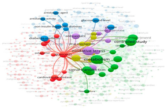 Quercetin has garnered significant attention in recent years. By the end of 2024, over 29,000 articles on quercetin were indexed in the Web of Science, Scopus, and PubMed, with more than 1,000 focusing on its effects on cardiovascular health, based on data retrieved from searches conducted up to November 2024. Figure 2 presents network visualizations of the publication trends and keyword associations related to quercetin in the context of diabetic cardiomyopathy. Despite this growing body of work, the molecular and mechanobiological aspects of quercetin in diabetic cardiomyopathy remain unclear. Understanding these mechanisms is crucial for guiding future research. This review aims to summarize and critically evaluate quercetin’s pharmacological mechanisms in this context.
