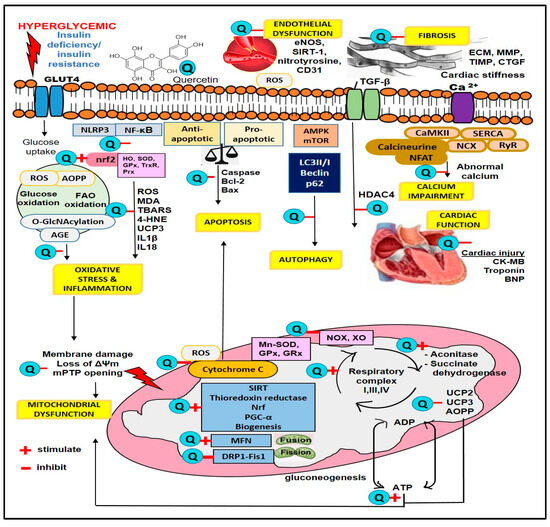 Altogether, these studies suggest that quercetin can preserve mitochondrial function and improve energy metabolism under hyperglycemic conditions, leading to enhanced myocardial contractile performance. This likely occurs through the modulation of key factors such as SIRT5, PGC-1α, Tfam, Mfn, PPARγ, DRP-1, mitochondrial thioredoxin reductase activity, and tricarboxylic acid cycle key enzymes, all of which play vital roles in mitochondrial quality control and homeostasis. Future studies could explore the effect of quercetin on the nuclear respiratory factor (NRF), the mitochondrial fission factor (MFF), and mitochondrial dynamics 49 (MiD49) and 51 (MiD51), which are involved in mitochondrial bioenergetics and fission. Additionally, its impact on mitochondrial mitophagy (selective degradation of damaged or dysfunctional mitochondria through the autophagy pathway), proteostasis (protein quality control), and mitochondrial DNA repair warrants further investigation.