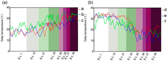The mean daily temperature throughout the growth of grape berries. (a) Summer crop daily average temperature trends. (b) Winter crop daily average temperature trends. Developmental stages: pruning (E-L 1); 5 leaves separated (E-L 12); berry pea size (E-L 31); green berries (E-L 33); beginning of veraison (E-L 35); full veraison (E-L 36); end of veraison (E-L 37); and harvest stage (E-L 38). Points a, b, and c denote measurements at the front, middle, and back of the greenhouses for the summer crop. Points d, e, and f denote measurements at the front, middle, and back of the greenhouses for the winter crop.