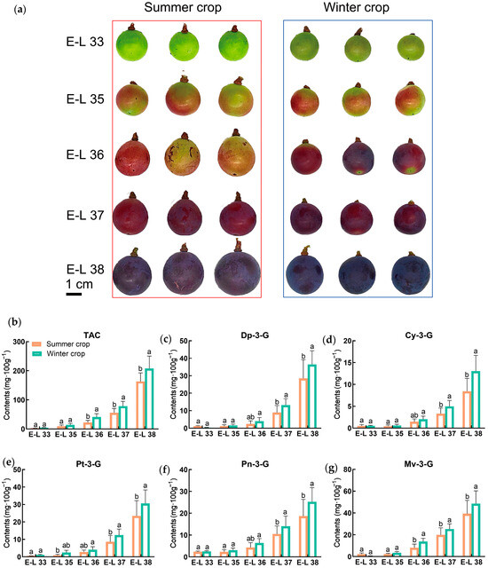 The effect of seasonal treatment on the content of anthocyanins in ‘Summer Black’ grape berries. (a) Grape berries in different developmental stages in winter and summer crops. (b) Total anthocyanin content in winter and summer crops. (c) Del-phinidin-3-O-glucoside (Dp-3-G) content in winter and summer crops. (d) Cyanidin-3-O-glucoside (Cy-3-G) content in winter and summer crops. (e) Petunidin-3-O-glucoside (Pt-3-G) content in winter and summer crops. (f) Peonidin-3-O-glucoside (Pn-3-G) content in winter and summer crops. (g) Malvidin-3-O-glucoside (Mv-3-G) content in winter and summer crops. Developmental stages: green berries (E-L 33); beginning of veraison (E-L 35); full veraison (E-L 36); end of veraison (E-L 37); and harvest stage (E-L 38). The vertical bars indicate the standard error of the mean (SEM). Statistical significance is denoted by distinct letters (p < 0.05).