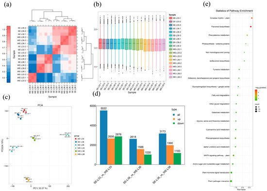 Analysis of gene expression profiles in the transcriptome. (a) Pearson correlation matrix of samples using transcriptome data. (b) Comparison analysis of gene expression levels across different experimental settings. (c) Principal component analysis (PCA) using gene expression levels. (d) Number of DEGs identified from seasonal comparisons. (e) Top 20 KEGG enrichment bubble map for DEGs between WE-L 38 and SE-L 38. Treatments: green berries from summer crop (SE-L33); full veraison in summer crop (SE-L36); harvest stage in summer crop (SE-L38); green berries from winter crop (WE-L33); full veraison in winter crop (WE-L36); and harvest stage in winter crop (WE-L38).