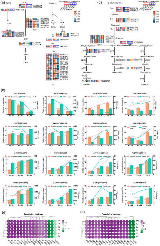 Differentially expressed genes (DEGs) in the circadian rhythm—plant pathway and flavonoid biosynthesis pathway under double-cropping cultivation. (a) DEGs in the circadian rhythm—plant pathway. (b) DEGs in the flavonoid biosynthesis pathway. Treatments: green berries from the summer crop (SE-L33) and full veraison in summer crop (SE-L36). (c) RT-qPCR validation of DEGs identified in RNA-seq analysis. (d) Pearson’s coefficient for summer crop. (e) Pearson’s coefficient for winter crop. Treatments: harvest stage in summer crop (SE-L38); green berries from winter crop (WE-L33); full veraison in winter crop (WE-L36); and harvest stage in winter crop (WE-L38). Orange boxes represent upregulated genes, while dark blue boxes represent downregulated genes. The red frame represents the summer crop, and the blue frame represents the winter crop. *, ** and *** indicate p ≤ 0.05, p ≤ 0.01, p ≤ 0.001, respectively.