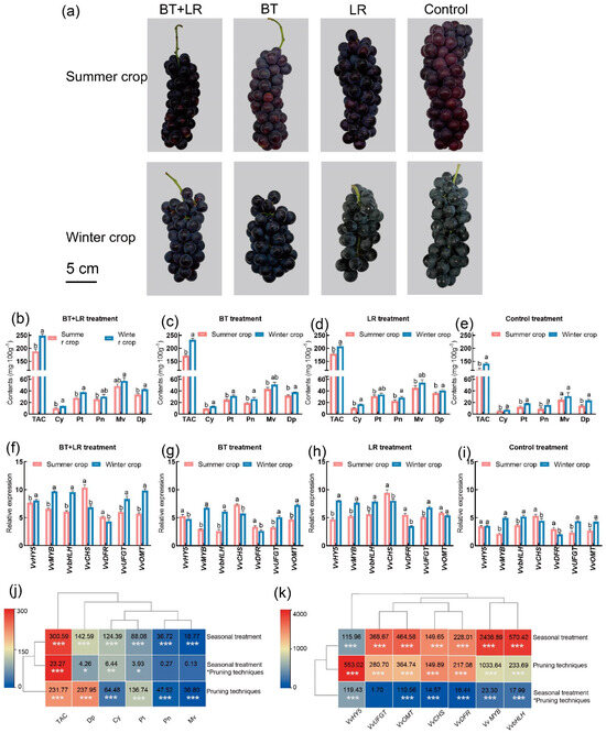 The effect of berry thinning (BT), basal leaf removal (LR), and their combination on the content of anthocyanins in ‘Summer Black’ grape berries in the harvest stage (E-L 38). (a) Visual appearance of representative bunches of ‘Summer Black’ table grapes harvested from vines subjected to treatments of berry thinning (BT), basal leaf removal (LR), and their combination. (b) BT+LR treatment anthocyanin content. (c) BT treatment anthocyanin content. (d) LR treatment anthocyanin content. (e) Control treatment anthocyanin content. (f) BT+LR treatment anthocyanin-related gene expression. (g) BT treatment anthocyanin-related gene expression. (h) LR treatment anthocyanin-related gene expression. (i) Control treatment anthocyanin-related gene expression. (j) Test of intersubjective effects of seasonal treatments and pruning techniques on anthocyanin content. (k) Test of intersubjective effects of seasonal treatments and pruning techniques on related gene expression. Developmental stages: green berries (E-L 33); full veraison (E-L 36); and harvest stage (E-L 38). The vertical bar denotes the standard error of the mean (SEM). Statistical significance is denoted by different letters (p < 0.05). *, ** and *** indicate p ≤ 0.05, p ≤ 0.01, p ≤ 0.001, respectively.