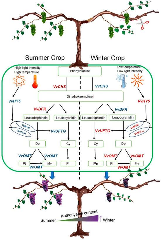 Grapes from the winter crop accumulated higher anthocyanin contents than those from the summer crop. This was a result of the lower temperatures in winter, which can activate a greater number of genes associated with anthocyanin synthesis and promote the production of their monomers. The differences in the total anthocyanin content and gene expression between the seasonal treatments were more significant than those between the pruning treatments.