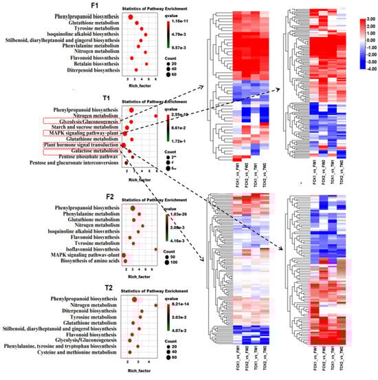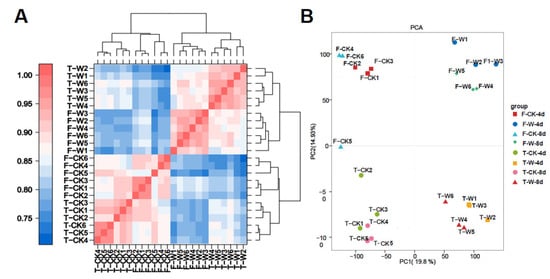 Correlation analysis showed that the correlation coefficients’ r2 between biological replicates were all above 0.8 (Figure 1A). Principal component analysis (PCA) showed that the expression patterns within the same treatment for a single material were relatively clustered, whereas the PCA distances between the different treatments or varieties were significantly wider (Figure 1B).