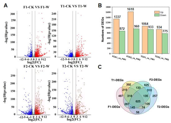 Differentially expressed genes (DEGs) in 4 groups (F1−CK vs. F1−W, F2−CK vs. F2−W, T1−CK vs. T1−W, and T2−CK vs. T2−W). (A): Volcano plot showing the DEGs in 4 groups. Red color represents up-regulated DEGs, blue color represents down-regulated DEGs, and gray color represents non-differentially expressed genes. (B): Histogram of DEGs in 4 groups. (C): Venn diagram of DEGs in 4 groups.