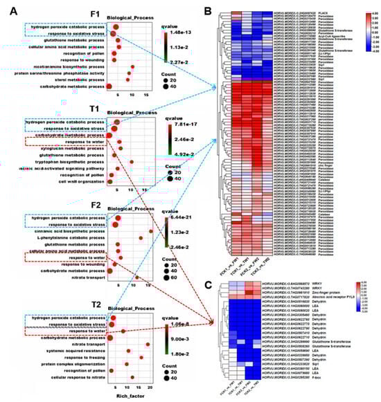In order to understand the GO entries that were significantly enriched compared to the whole genomic background, the differential gene sets for each subgroup were analyzed for the enrichment of the biological processes, molecular functions, and cellular components, respectively, using ClusterProfiler employing hypergeometric tests. The term obtained from the enrichment results were visualized using a bubble chart (Figure S1). Cellular components were mainly enriched in the extracellular region, apoplast, anchored component of the plasma membrane, and cell wall. In terms of molecular functions, the genes were mainly enriched in heme binding, oxidase activity, iron ion binding, and the incorporation of one atom of oxygen. For the biological process classification, both the top two enrichment terms in the two genotypes are related to hydrogen peroxide catabolic process, which mainly includes the differentially expressed genes encoding peroxidase. Notably, after 4 days of waterlogging stress, more genes were specifically enriched on the waterlogging tolerance genotype TamF169, while, after 8 days of waterlogging stress, similar enriched genes were found in both genotypes (Figure 3). In the term of response to waterlogging, genes encoding LEA (late embryogenesis abundant protein) and dehydrin, such as HORVU.MOREX.r3.1HG0058690, HORVU.MOREX.r3.4HG0339950, and HORVU.MOREX.r3.5HG0507390, were significantly decreased only in the waterlogging-tolerant genotype TamF169.