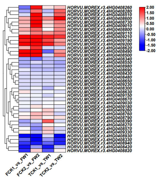 To validate differentially expressed genes identified in the RNA sequencing data, 15 DEGs were selected for the qRT-PCR analysis. These DEGs were HORVU.MOREX.r3.7HG0710070 (1, peroxidase), HORVU.MOREX.r3.2HG0112640 (2, peroxidase), HORVU.MOREX.r3.2HG0215250 (3, peroxidase), HORVU.MOREX.r3.3HG0325250 (4, peroxidase), HORVU.MOREX.r3.3HG0305460 (5, dehydrin), HORVU.MOREX.r3.5HG0516830 (6, dehydrin), HORVU.MOREX.r3.6HG0622710 (7, dehydrin), HORVU.MOREX.r3.6HG0622760 (8, dehydrin), HORVU.MOREX.r3.6HG0622770 (9, dehydrin), HORVU.MOREX.r3HG0058690 (10, late embryogenesis abundant protein), HORVU.MOREX.r3HG0080000 (11, late embryogenesis abundant protein), HORVU.MOREX.r3.4HG0408330 (12, WAT1-related protein), HORVU.MOREX.r3.4HG0409010 (13, basic helix–loop–helix transcript factor), HORVU.MOREX.r3.4HG0409200 (14, glutathione S-transferase), and HORVU.MOREX.r3.4HG040860 (15, GDSL esterase/lipase). This qRT-PCR result was consistent with the transcriptome data (Figure 6).