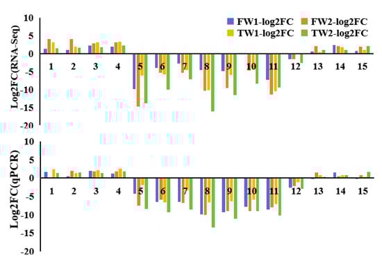The qPCR validation of 15 differentially expressed genes in the RNA−Seq data.