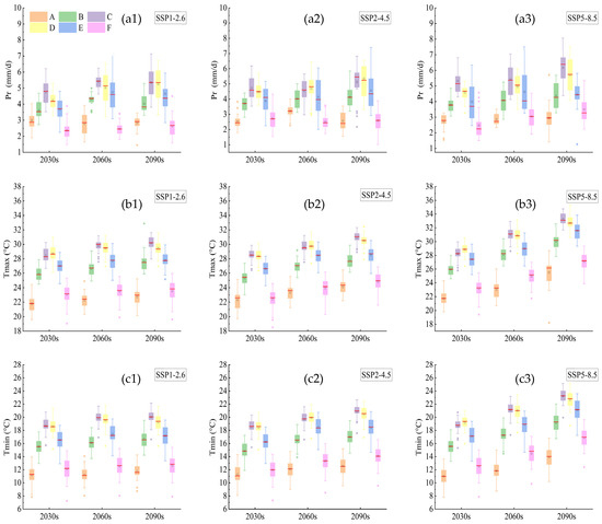Trends of Pr (a1–a3), Tmax (b1–b3) and Tmin (c1–c3) under SSP1-2.6, SSP2-4.5 and SSP5-8.5 during each growth period of rice from 2015 to 2100. Pr, Tmax and Tmin represent precipitation, maximum air temperature and minimum air temperature, respectively. The 2030s, 2060s and 2090s represent the period of 2015–2040, 2041–2070 and 2071–2100, respectively. A, B, C, D, E and F represent the returning green stage, tillering stage, jointing booting stage, heading flower stage, milk stage and yellow ripening stage of rice, respectively. In the box-plot, the red line, the black square and the diamond represent the median, the mean and the outliers, respectively.